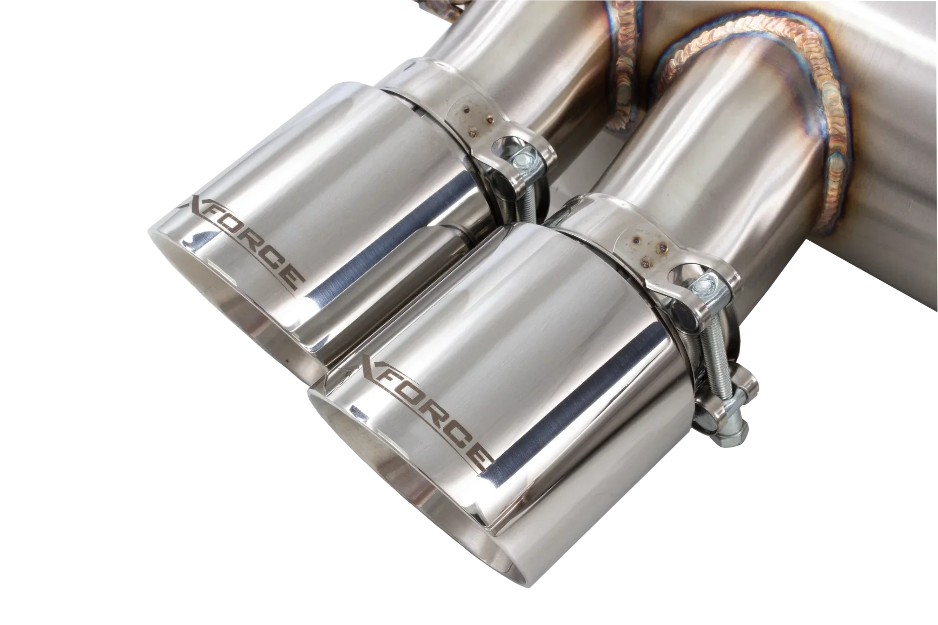 - Quad 3″ outlet with polished double wall angle 4″ tips with bolt on installation